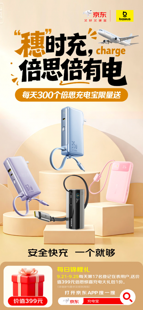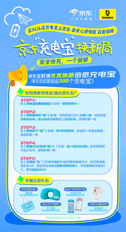 旅客凭当日机票及旧充电宝即可参与免费换新。若未携带旧充电宝,出示京东相关购买记录与机票也可享受换新服务。现场特别设置互动体验区,通过浏览充电宝会场、参与拼图游戏等互动,帮助旅客在轻松氛围中增强安全意识,完成互动即可获得精美旅行礼品,让候机时光更有趣。值得一提的是,活动期间每天第17名登机在表的用户,还将送价值399元倍思惊喜充电大礼包1份。