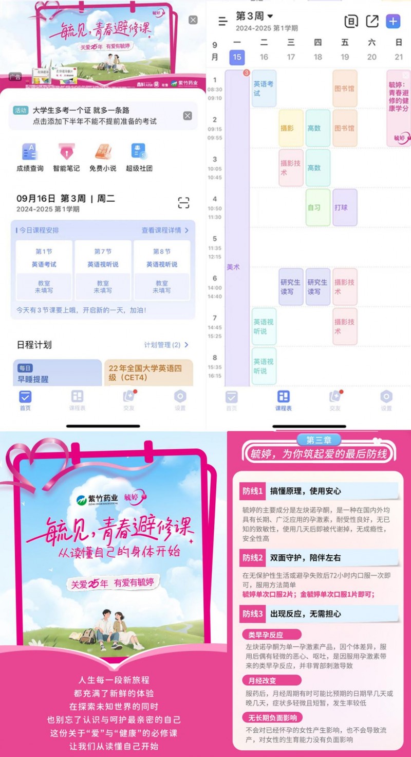 特别是毓婷与“超级课程表”的合作,精准切入大学生群体。通过课程表界面嵌入、小纸条推送、银河app手机版下载首页推广等自然融入日常学习场景的方式,将“青春避修课”相关内容无缝对接至学生的校园生活,持续传递传播女性生理健康与科学避孕等实用知识。此外,美图秀秀银河app手机版下载首页的曝光资源也为本次活动带来广泛关注,进一步扩大了传播声量。