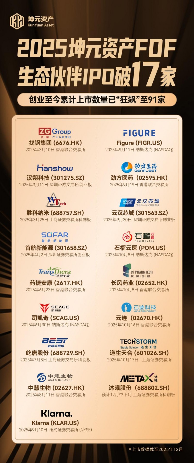 截至目前,坤元资产通过其前瞻性的fof生态圈投资布局,收获累累硕果。自成立以来,坤元资产fof生态圈伙伴上市企业数量累计达91家,仅2025年就成功收获了17家ipo。